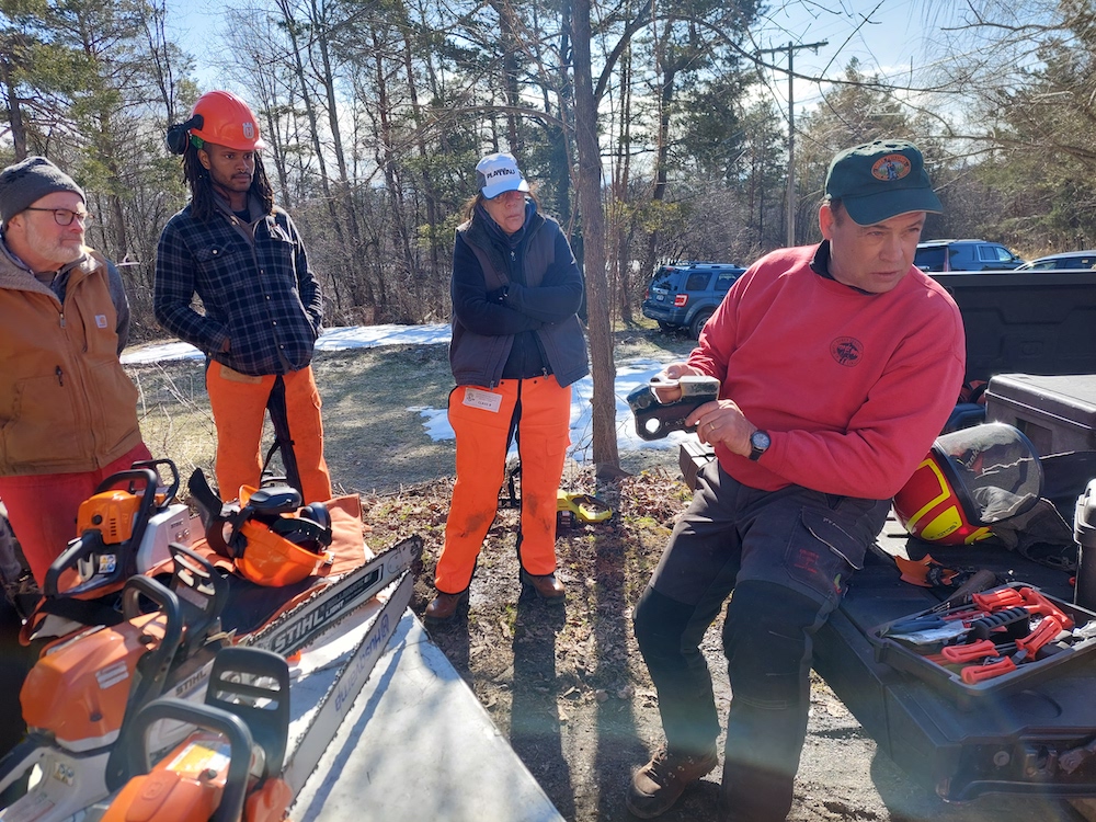 After lunch, we headed to the woods to fell some trees. Bill did the first one, a hefty, back-leaning white pine. He demonstrated the HELP method, which helps you create a felling plan for each tree you are planning to cut down. HELP stands for Hazards, Escape path, tree Lean, and Plan your cut. Elizabeth Marks explains the process in more detail in her blog (see paragraph 5).