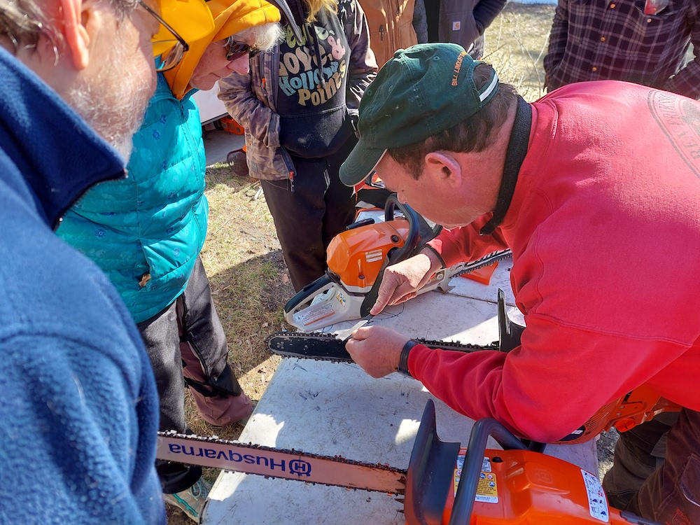 Bill started the day with an introduction about GOL, how it changed the way he operates in the woods, and how he came to be an instructor. We covered PPE (e.g., chaps, helmet and face shield, hearing protection, and footwear), chain sharpening, basic saw maintenance, and reactive forces on different parts of the saw bar. For example, when cutting with the top of the bar, the saw pushes you back. Cutting with the bottom side pulls you in. At the tip of the bar, the top half causes the saw to kick back towards your upper body (not good), while the bottom half of the bar tip can be used safely, for example in a bore or plunge cut.
