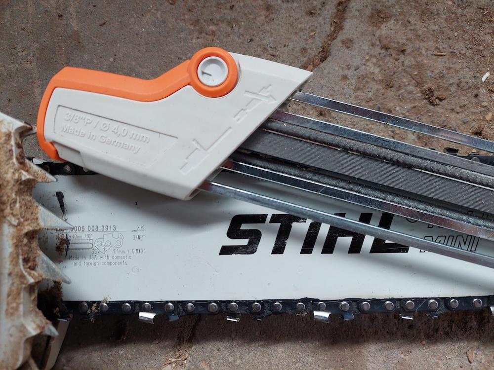 Then he used a round file with a roller guide to sharpen the teeth. The rollers ensure that the round file runs through the proper position in the tooth.