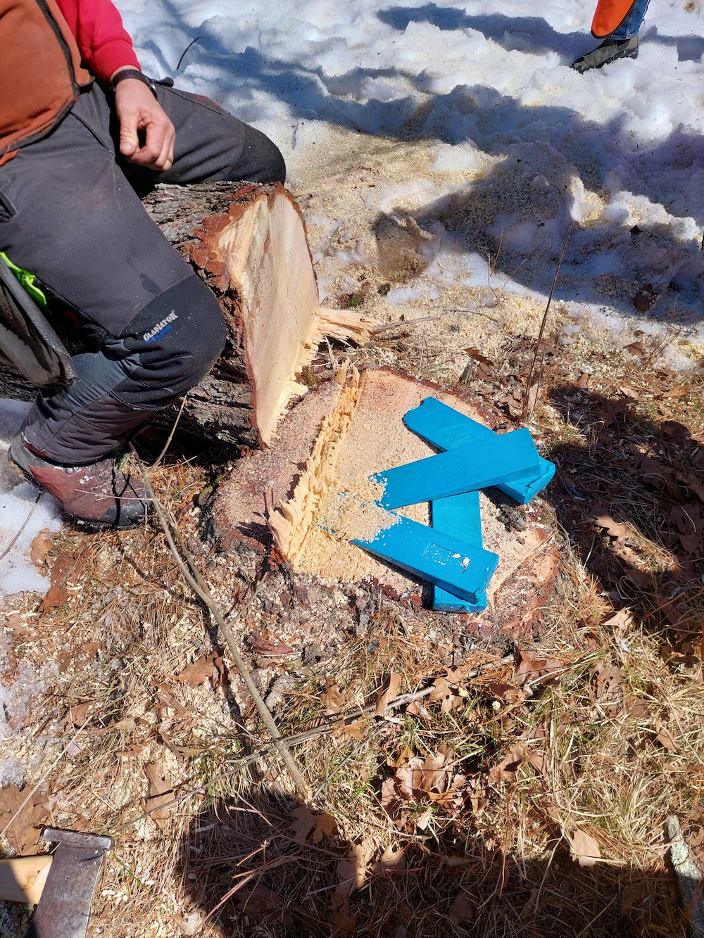 Here, we started to solidify the calculations for hinge length (80% of the tree’s diameter at breast height (DBH)) and hinge thickness (10% or less of the tree’s DBH). Generally, hardwoods can have thinner hinges than softwoods because their wood is stronger.
